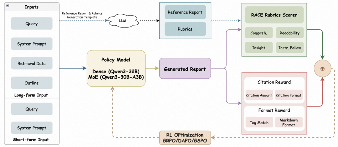 Search-RL 解决了“如何找到答案”的问题,Report-RL需要解决“如何将复杂检索结果整合成一篇高质量长报告”的问题。MindDR 1.5 以 RACE Rubrics 为核心奖励机制,围绕全面性、指令遵循、洞察力、可读性四个维度建立长报告质量优化目标,并进一步引入引用和格式奖励以优化用户体验。主要训练流程如下:长短文本输入策略模型生成报告,与前沿大模型生成的参考报告和rubrics进行对比,获取RACE得分奖励和辅助引用、格式奖励,通过RL算法优化策略模型参数。