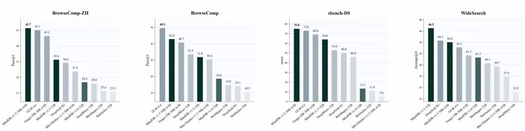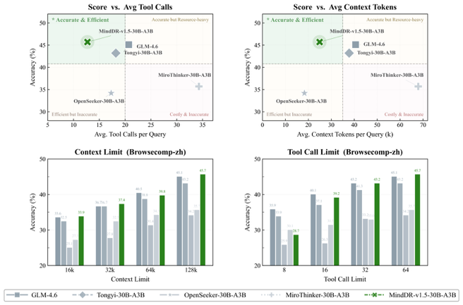 而在不同的上下文长度、工具调用次数限制条件下,MindDR 1.5模型都展现了领先的深度搜索性能。