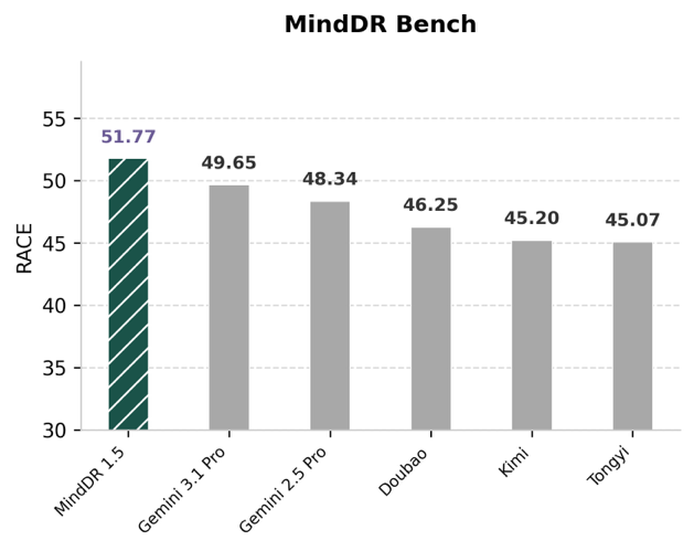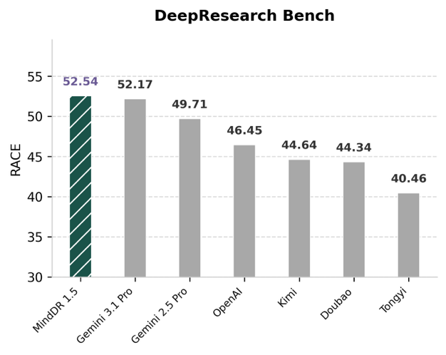 在DeepResearch Bench上,MindDR 1.5取得 52.54 分,超越国内外主流 Deep Research 产品,深度研究能力达到行业顶尖水平;在MindDR Bench 上,MindDR 1.5以 51.77 分位居首位,验证了其在真实用户场景中稳定、优异的表现。