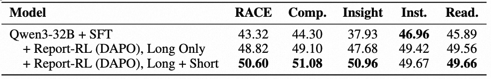 Report-RL 的训练数据融合了两种优势互补的形式:一类是包含完整检索结果的长上下文数据,能够最大程度还原真实检索与推理环境;另一类是仅由 Query 和系统提示词构成的短上下文数据,更聚焦于写作能力。在 MindDR Bench 上的对照实验评估中,模型得分由 48.82 提升至 50.60,验证了混合训练的互补优势。
