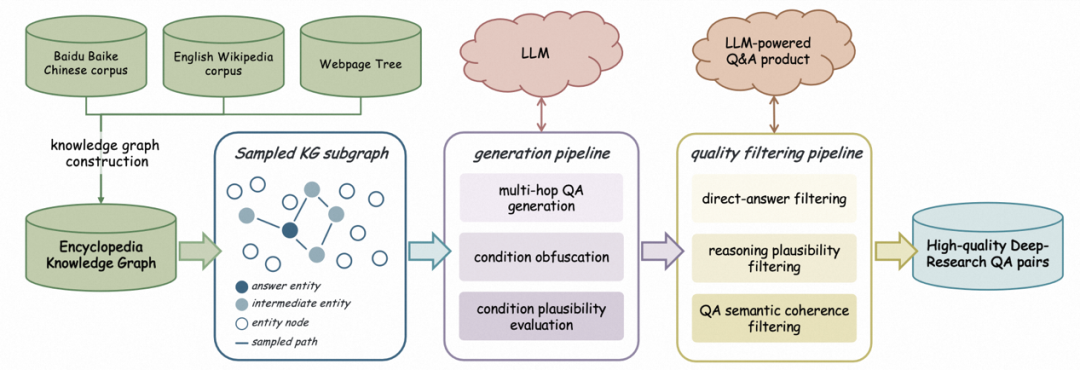 为满足深度搜索中长程推理的训练数据需求,我们构建了一套数据合成管线。该管线包含图谱构建、多跳子图采样、QA 生成与数据过滤四个阶段,用于生成高质量的复杂多跳问答对,从而支撑Search-RL训练。我们还在训练中集成了动态数据合成,随训练进程逐步增加数据难度,避免数据简单或者过难导致的训练不稳定问题。