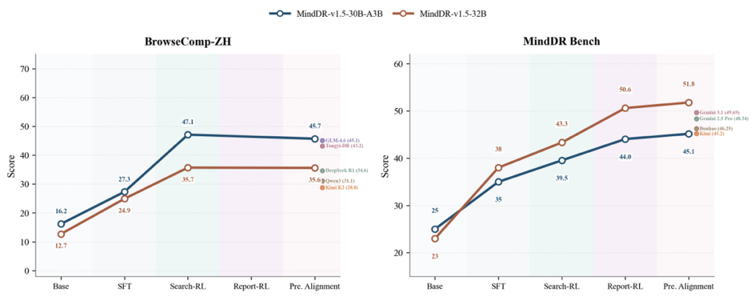 为此我们推出 MindDR 1.5,它基于自研模型和多智能体协作架构,在训练上跳过 mid-training 阶段,采用多阶段训练替代端到端优化,以较低成本在相对较小规模(30B)的模型上取得业界领先水平,性能优于同等规模的开源智能体系统,并能超越部分更大规模模型的效果。