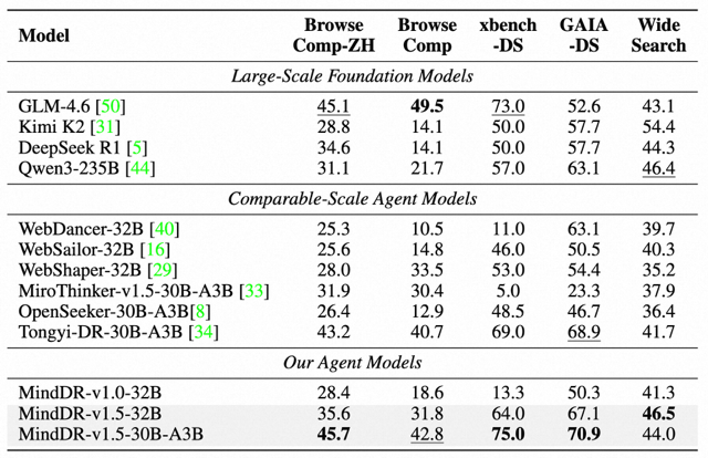 MindDR为深度研究领域提供了一套「小模型、低成本、高性能」的训推范式,通过多智能体协作推理框架以及多阶段训练管线在小尺寸模型上取得业界领先性能,为深度研究智能体以及通用智能体发展探索了新的技术路径。