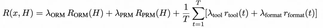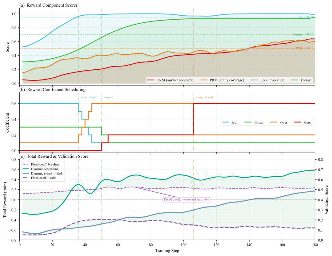 关键设计在于,四项系数并非固定不变,而是采用阈值触发的动态调度策略,遵循"从基础行为到深层推理"的递进逻辑:训练初期以工具调用与格式奖励为主,当基础能力饱和后,权重逐步向过程奖励和结果奖励转移,最终由 ORM 主导优化方向。这一自适应耦合机制确保每项能力在其对应的训练阶段获得集中监督,模拟了从基础技能到深度推理的"顿悟式"能力递进。