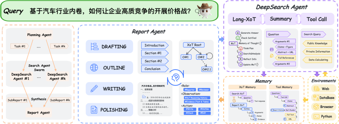 规划者:Planning Agent,负责理解用户意图并拆解为独立子任务; 搜索者:DeepSearch Agent,负责接收子任务执行并行多轮检索、验证与长程推理,专注于信息获取与事实校验; 撰写者:Report Agent,负责整合搜索者提供的多来源证据,生成结构化高质量长报告。