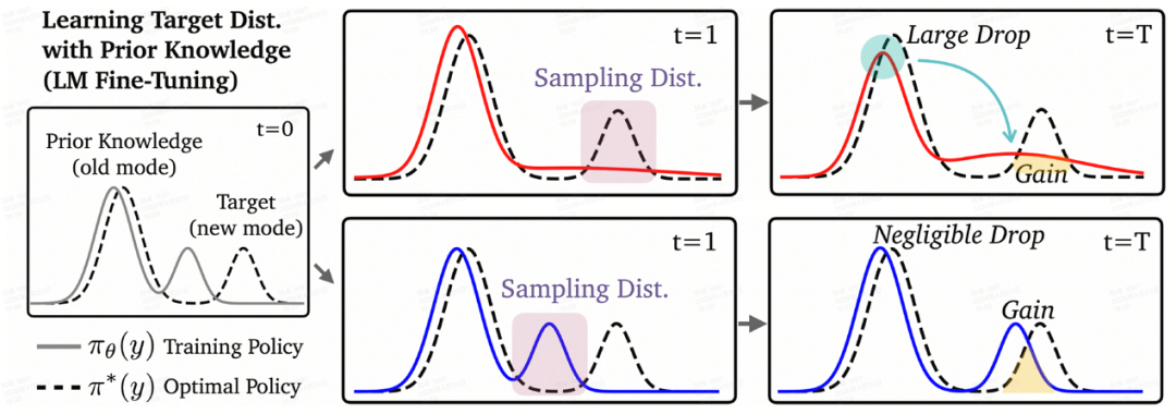 Self-SFT稳定训练防止灾难性遗忘原理。图片改自Self-SFT原论文(https://arxiv.org/pdf/2510.18874)