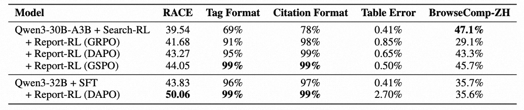 SFT:负责模型冷启动,通过模仿学习建立工具调用、格式遵循与多轮推理的基础能力。 Search-RL:专注优化深度搜索、信息获取能力。强化长链路深度搜索与自主决策能力,基于真实工具调用环境实现在线学习,结合奖励机制设计和动态调度,实现能力的渐进式提升。 Report-RL:专注优化长篇报告撰写能力,以 RACE Rubrics 为核心牵引,结合引用格式作为辅助奖励,全面优化报告生成质量。 偏好对齐:进一步优化细粒度用户体验。包括时态一致性、表格格式正确率等,通过自采样 DPO 和 Self-SFT 将模型输出对齐到人类偏好分布,同时避免出现灾难性遗忘。
