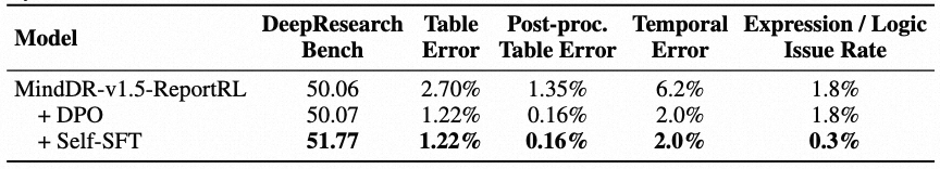 自采样 DPO 适合处理局部、模式明确的问题,我们用来修复时态和表格排版错误等问题; Self-SFT 能优化更整体的效果表现,我们用来提升逻辑和表达一致性,使报告更自然、连贯。