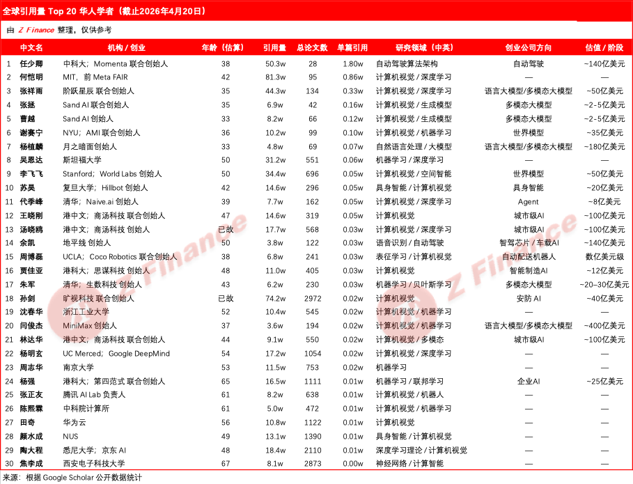 余凯(地平线):引用量约 3.8 万,单篇平均引用表现突出,关联公司估值约 140 亿美元。他的路径说明,当学术深度与底层硬件能力结合时,研究成果可以转化为极具壁垒的产业基础设施。