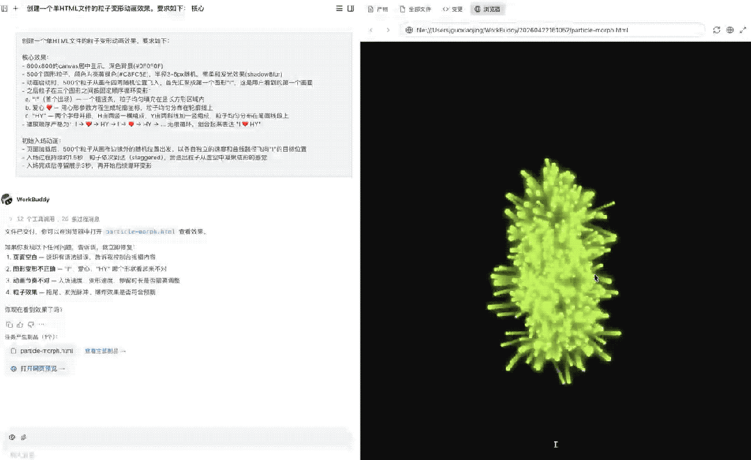 最终首屏顺序是对的、三个图形清晰、粒子分布均匀、变形平滑,这是一个综合能力题,说明模型真的具备了比较好的需求理解、空间建模、动画实现和工程收敛能力。