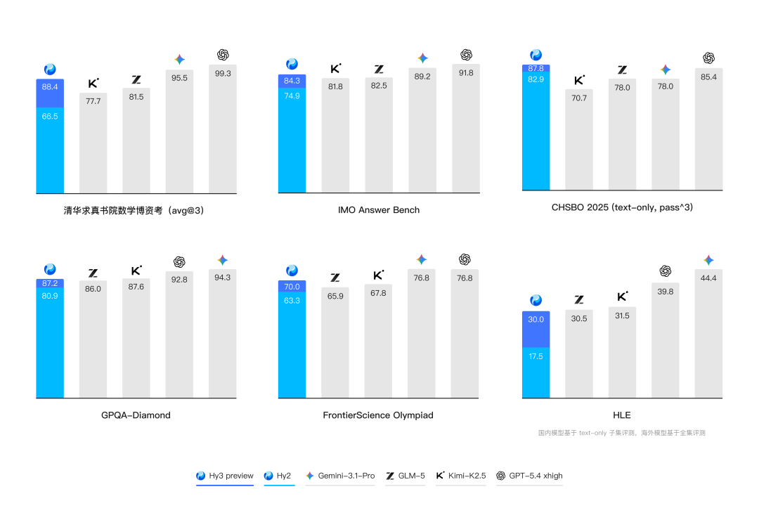 复杂推理能力是模型解决各种问题的基础。Hy3 preview 在 FrontierScience-Olympiad、IMOAnswerBench 等高难度理工科推理任务中表现突出,并在最新的清华大学求真书院数学博资考(26春)和 全国中学生生物学联赛(CHSBO 2025) 中取得优异成绩,展现了可泛化的强推理能力。