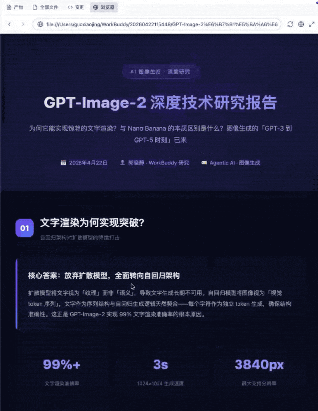 提示词是:基于OpenAI最新发布的image2进行深度研究并形成深度研究报告:为何它能实现如此惊艳逼真的文字渲染?官方是否公开过更多技术细节?它和image1.5有什么本质不同?为何不再以4o、5o的系列名字命名?它和竞品nanobanana的技术架构的不同,为何实现效果又比nanobanana更进一步?输出文字版的调研报告和可视版的html页面。