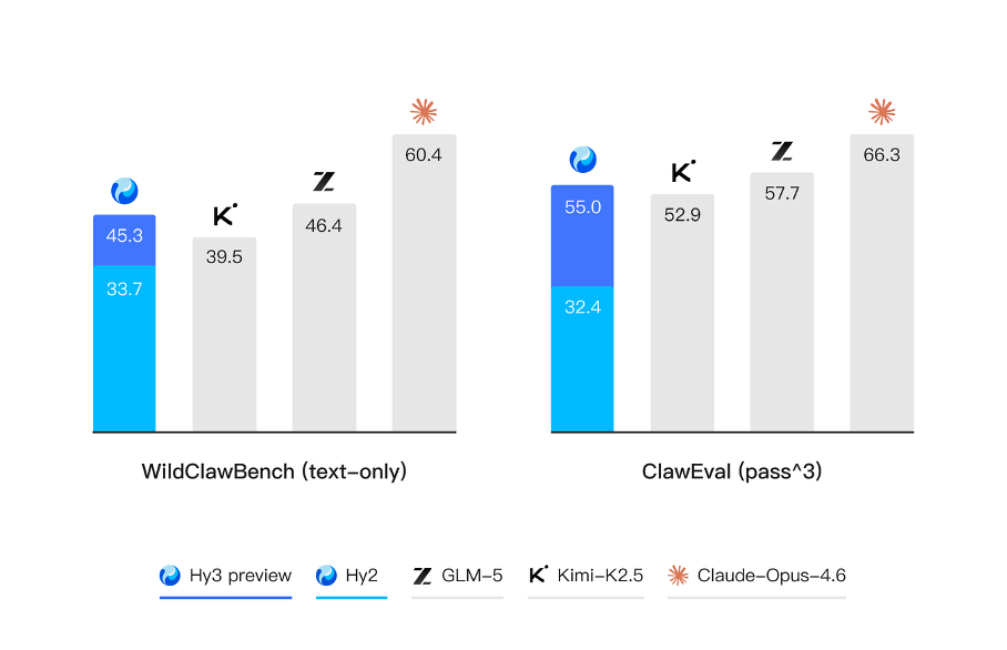 在数字世界中,代码关注的是模型在开发环境中的执行能力,搜索则聚焦于开放信息空间中的检索、筛选与整合能力,两者共同决定了模型在复杂智能体场景(例如 OpenClaw)中是否真正具备可用性。Hy3 preview 在 ClawEval 和 WildClawBench 等评测中表现突出,表明我们的智能体能力正在稳步走向全面与实用。