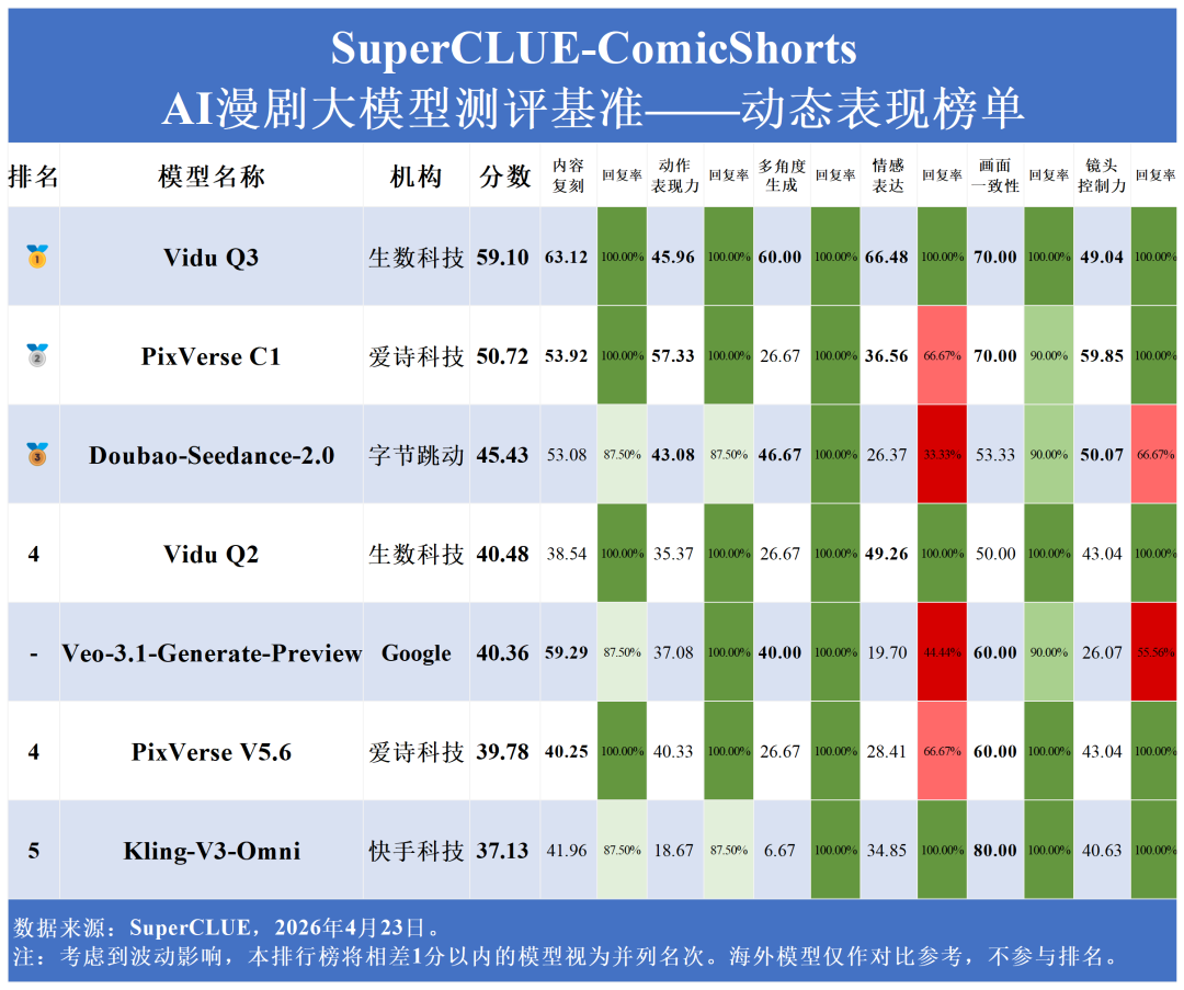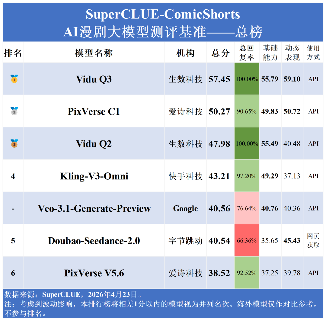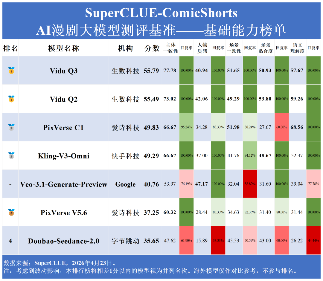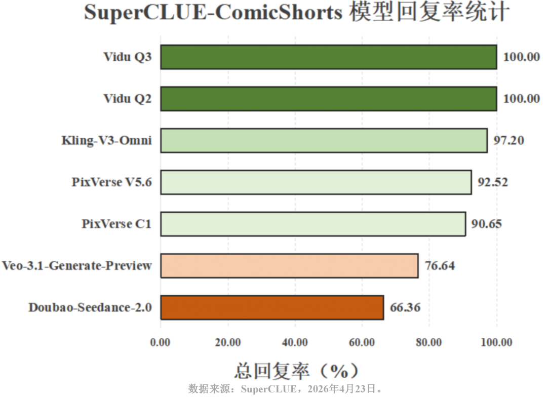 1. Vidu Q3、Vidu Q2表现最佳,回复率为100%,能适配多种内容的漫剧视频生成要求;
