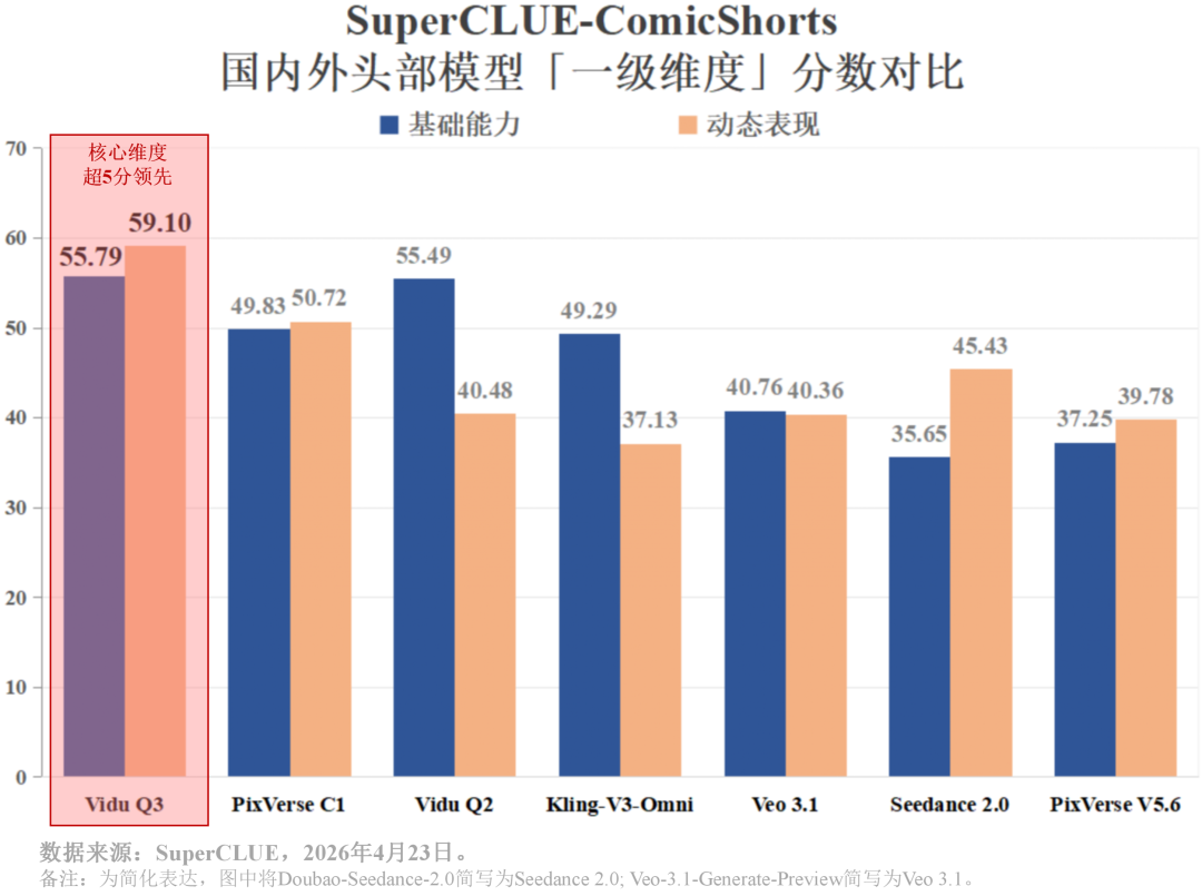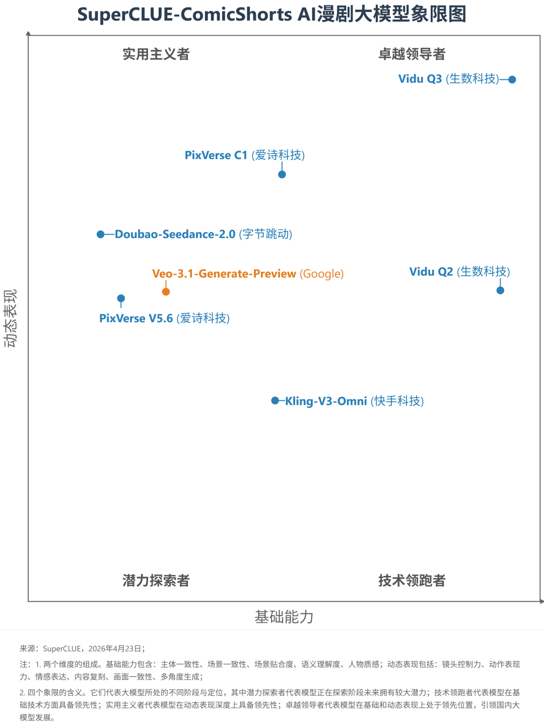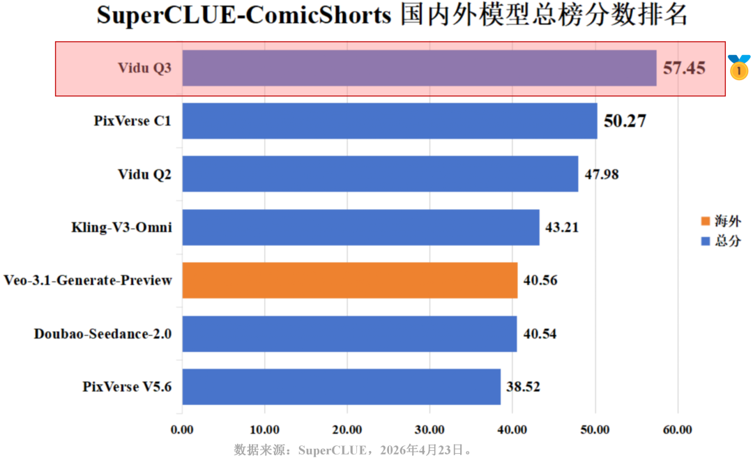 生数科技 Vidu Q3 不仅以 57.45 分强势登顶总榜,更在基础能力 (55.79分) 和动态表现 (59.10分) 均夺得桂冠;爱诗科技PixVerse C1 (50.72分)、生数Vidu Q2位列总榜二、三。相比之下,Google的Veo-3.1-Generate-Preview (总分40.56) 综合表现仅位列榜单中下游, AI漫剧这一垂直领域上国内已然领先。