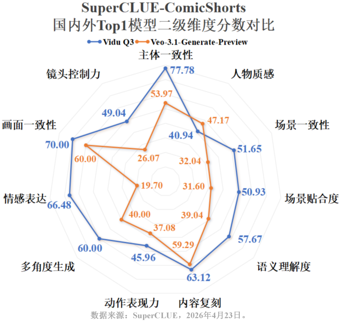 Vidu Q3与Veo-3.1-Generate-Preview对比中,展现了极强的维度覆盖优势。在决定漫剧叙事张力的核心维度上,Vidu Q3保持领先,如主体一致性(77.78 vs 53.97)、情感表达 (66.48 vs 19.70) 、镜头控制力(49.04 vs 26.07)、在多角度生成(60.00 vs 40.00)等;核心维度均超过10-20分差。