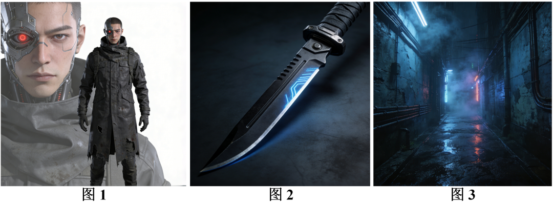 提示词:@图3的暴雨巷道中,0~1.5s:低角度急速推近,聚焦@图1的男性人物拔刀瞬间,清晰呈现高频振动的@图2的长刀出鞘时蓝色能量纹路点亮过程,刀锋划破雨幕产生第一道高温蒸汽雾气,风衣下摆随爆发力向后剧烈翻飞,严格复刻角色机械义眼光效。1.5~3.0s:侧面跟随滑步视角,人物贴地极速突进,长刀挥出完美蓝色电弧弧线,还原雨水被劈开的真空通道,通道边缘雨水气化凝结冰晶碎片,高密度粒子解算,保留武器金属质感与能量纹路。3.0~5.0s:仰拍快速旋转,捕捉腾空回旋斩,蓝色电弧与刀身轨迹毫秒级同步,能量波纹与霓虹光影、雨雾形成复杂体积光交互,无动态模糊细节丢失,定格冰晶炸裂瞬间,保持电影级动作连贯与特效精度。