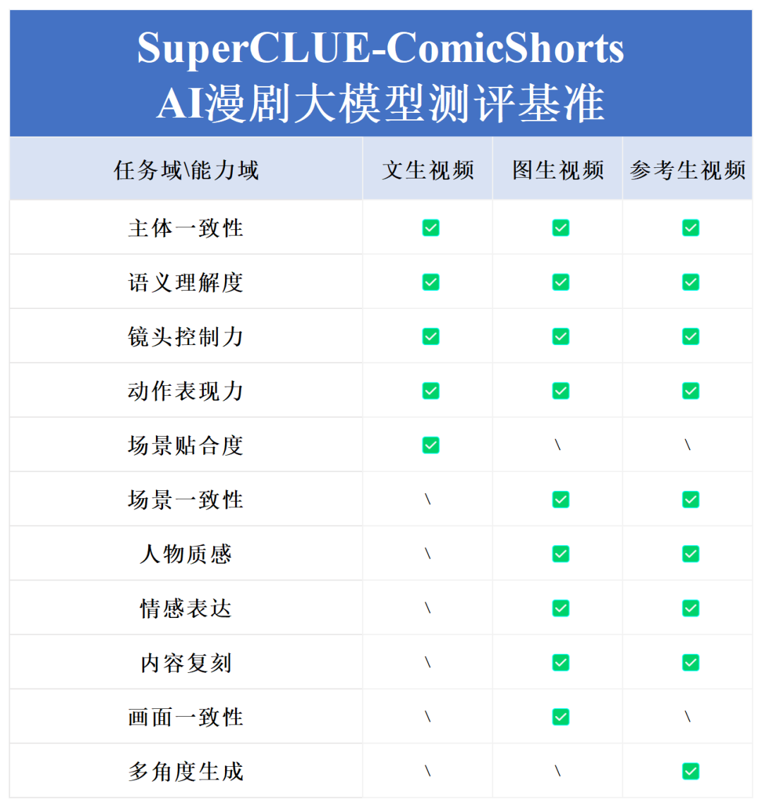 SuperCLUE-ComicShorts 是一个专为漫剧生成场景下的专项评测基准,旨在测评视频生成模型在生成动漫与短剧下的综合能力评估参考。基准包括文生、图生与参考生视频三项模型能力,基础能力与动态表现两大核心维度,涵盖11个二级维度。