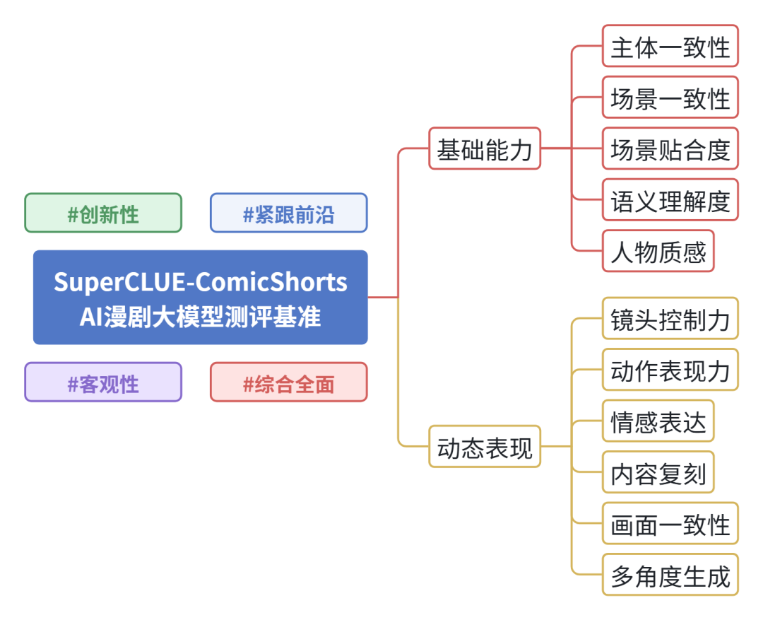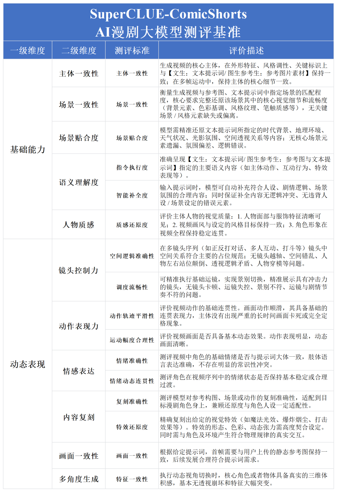SuperCLUE-ComicShorts 立足中文语境与漫剧内容生成领域,不仅综合衡量模型在文生视频、图生视频及参考生视频三项核心能力上的综合表现,更围绕基础能力与动态表现两大维度展开测评。其中基础能力涵盖主体一致性、场景一致性、场景贴合度、语义理解度与人物质感五大维度;动态表现则聚焦镜头控制力、动作表现力、情感表达、内容复刻、画面一致性与多角度生成六大维度。