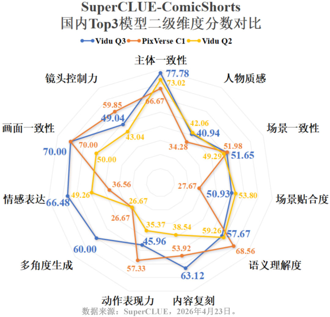 与国内模型对比中,Vidu Q3在主体一致性(77.78)和内容复刻(63.12)上稳居榜首。在漫剧创作中关键的情感表达上,Vidu Q3显著拉开了与次优模型(66.48 vs 49.26)的距离,证明了其在赋予AI角色生命力、统一叙事风格方面的卓越表现。