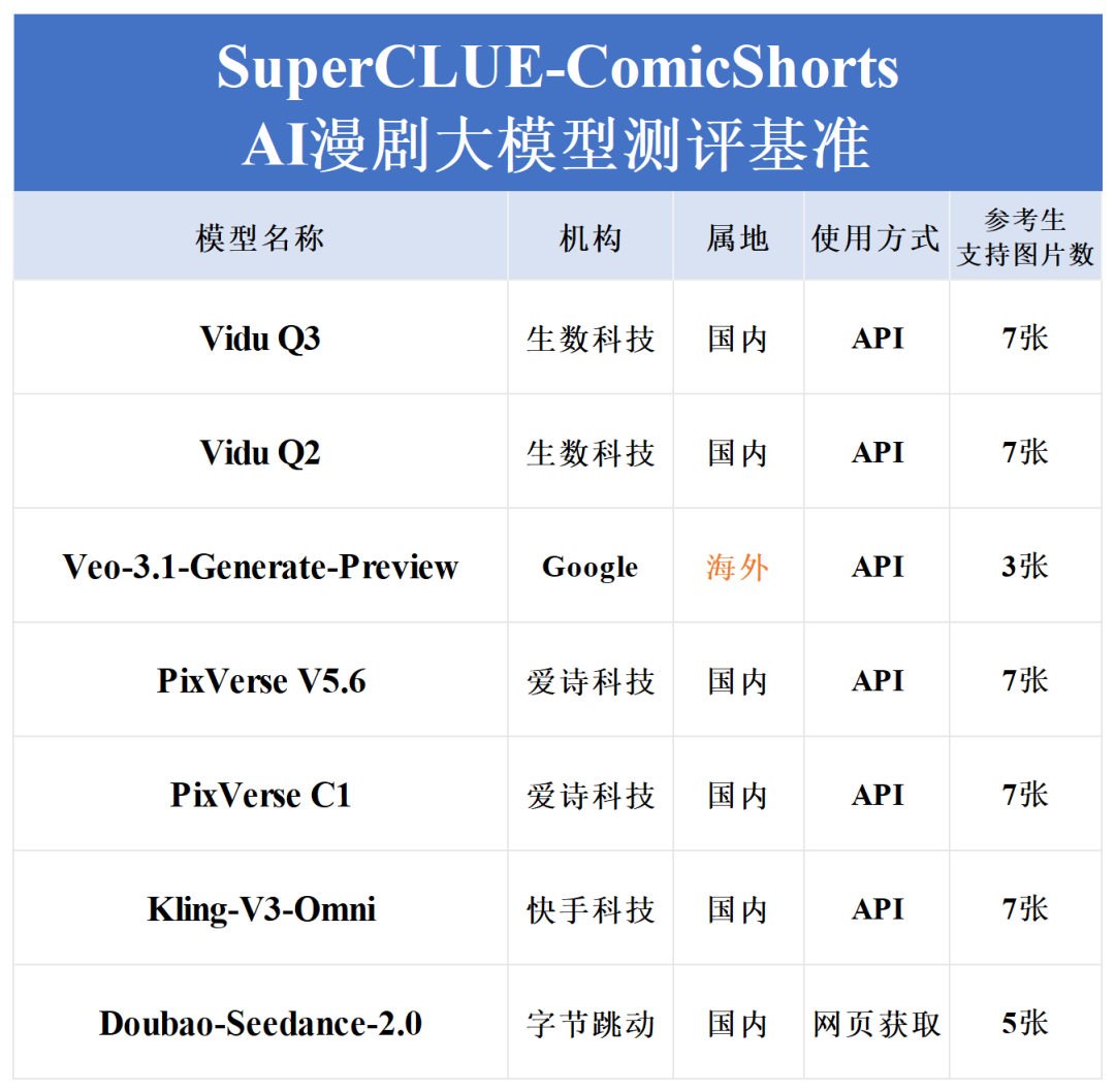 为综合衡量国内外视频生成模型在漫剧生成内容上的发展水平,本次测评选取了具备综合能力的1款海外模型和6款国内模型。