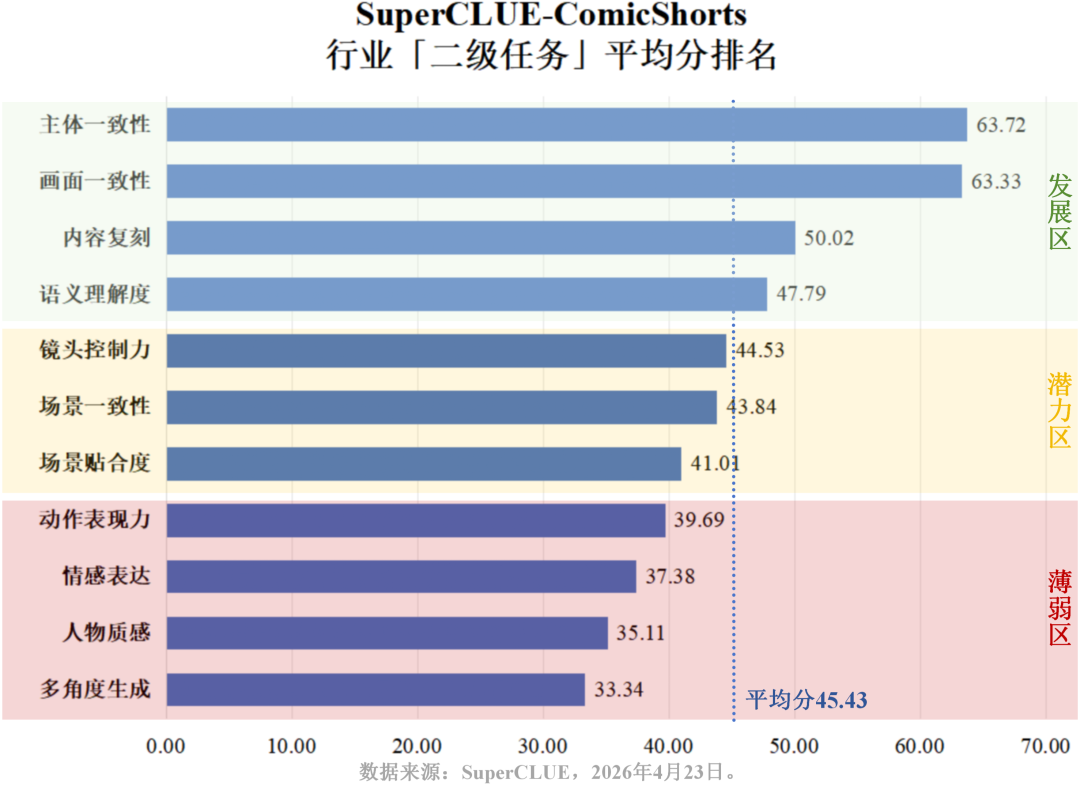 2026 年 4 月,全球首个中文原生AI漫剧大模型测评基准 (SuperCLUE-ComicShorts) 首期榜单正式发布。该基准以前沿性、全面性、挑战性为核心理念,立足中文语境对模型开展深度评测。为精准衡量模型在多类输入条件下的真实生成能力,本次测评聚焦视频生成模型的文生视频、图生视频、参考生视频三大任务场景,综合评估模型在动漫风格与短剧内容创作上的整体表现,围绕基础能力与动态表现两大关键维度展开评价。