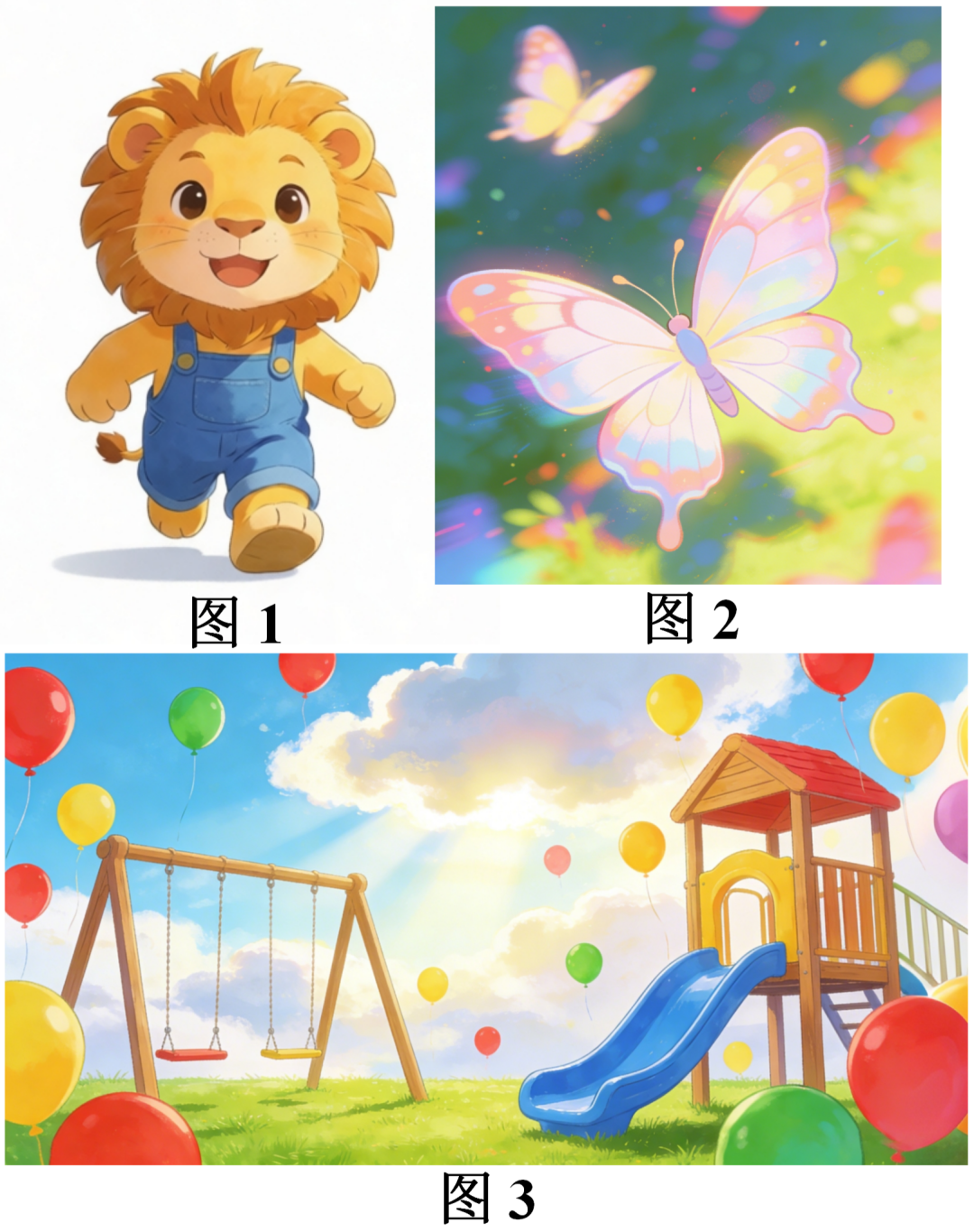【提示词】:镜头起始于@图1卡通拟人化的小狮子的中景特写,随后镜头缓慢向后拉远并向上抬升,展现出一个完整的@图3的儿童乐园场景,包括滑梯、秋千和彩色气球。小狮子开始在草地上欢快地奔跑,追逐一只@图2飞舞的卡通风格的蝴蝶,动作需流畅自然,富有弹性与节奏感。镜头需跟随小狮子的运动轨迹进行平滑摇摄,并在其跳跃时轻微推近,突出其喜悦的表情与动态细节。整体画面色彩明亮饱和,保持儿童友好的卡通渲染风格,动态表现需生动活泼,符合儿童认知习惯与审美偏好。