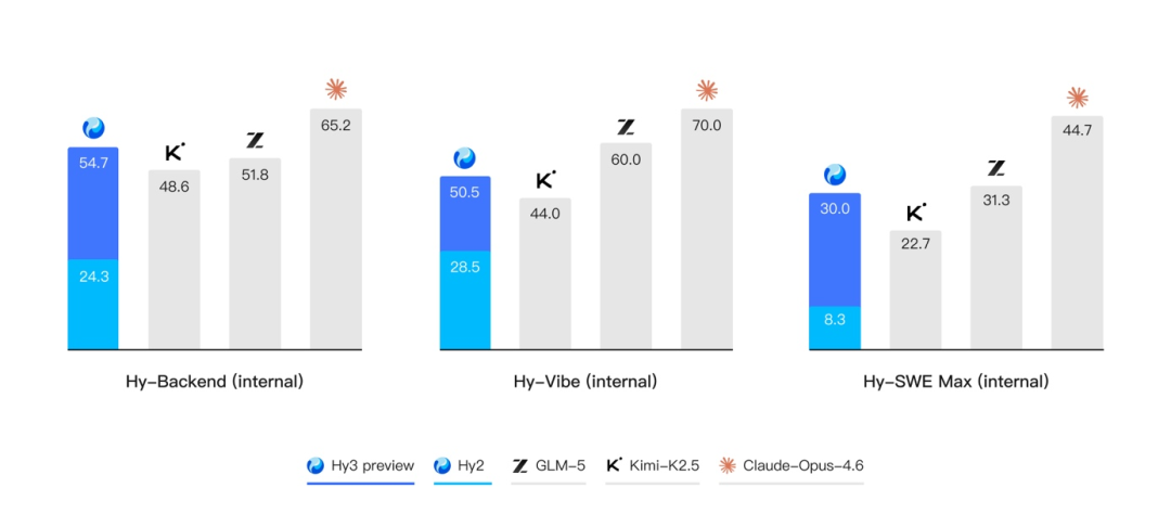 除了公开榜单,腾讯混元还进一步构建了多个内部的评测集,对模型在真实开发场景中的表现进行评估。结果表明,无论是在后端工程任务集 Hy-Backend,贴近真实用户开发交互的 Hy-Vibe Bench,还是高难度软件工程开发任务集 Hy-SWE Max 上,Hy3 preview 均体现出了强竞争力。