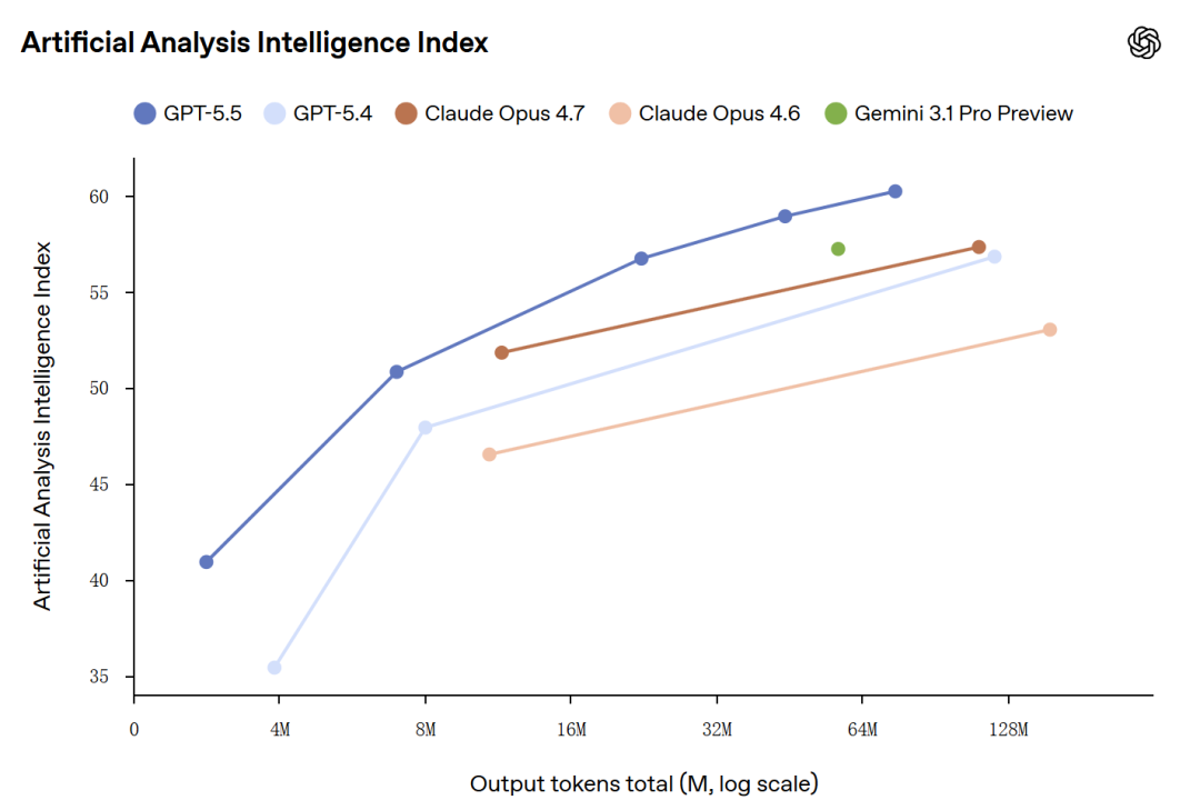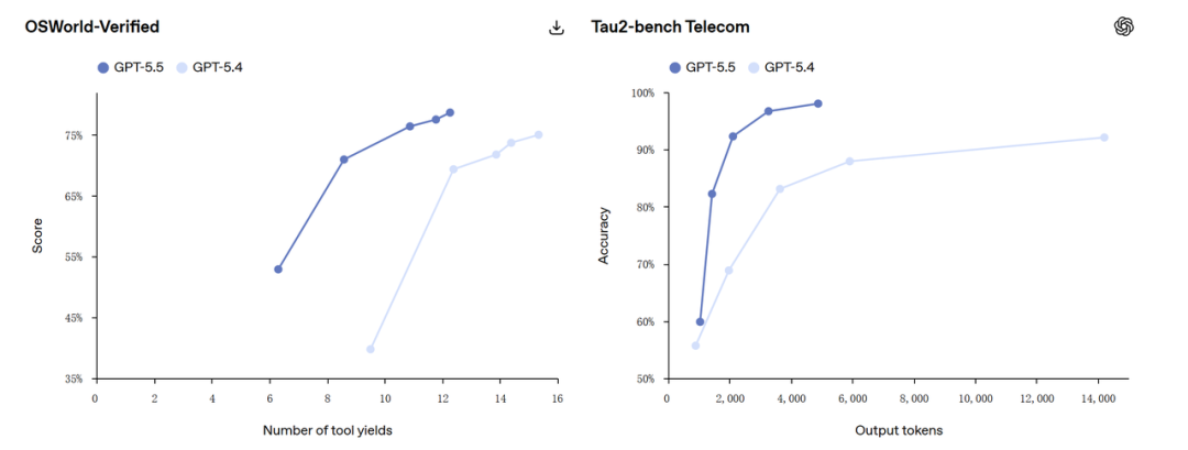Agentic Coding:能自主完成多步编程任务,不需要一步步指导。 Computer Use:看屏幕、点击、打字、切窗口、跨工具导航。 知识工作:分析数据、写文档、创建表格。 科研:GPT-5.5在更少的output tokens下实现相同效果。