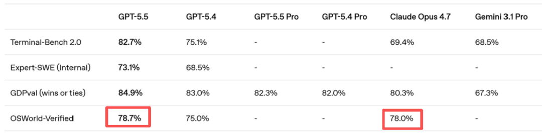 比之GPT-5.4,GPT-5.5 得分大幅提升,拿到 78.7%,再次战胜了 Claude Opus 4.7 的 78.0%。