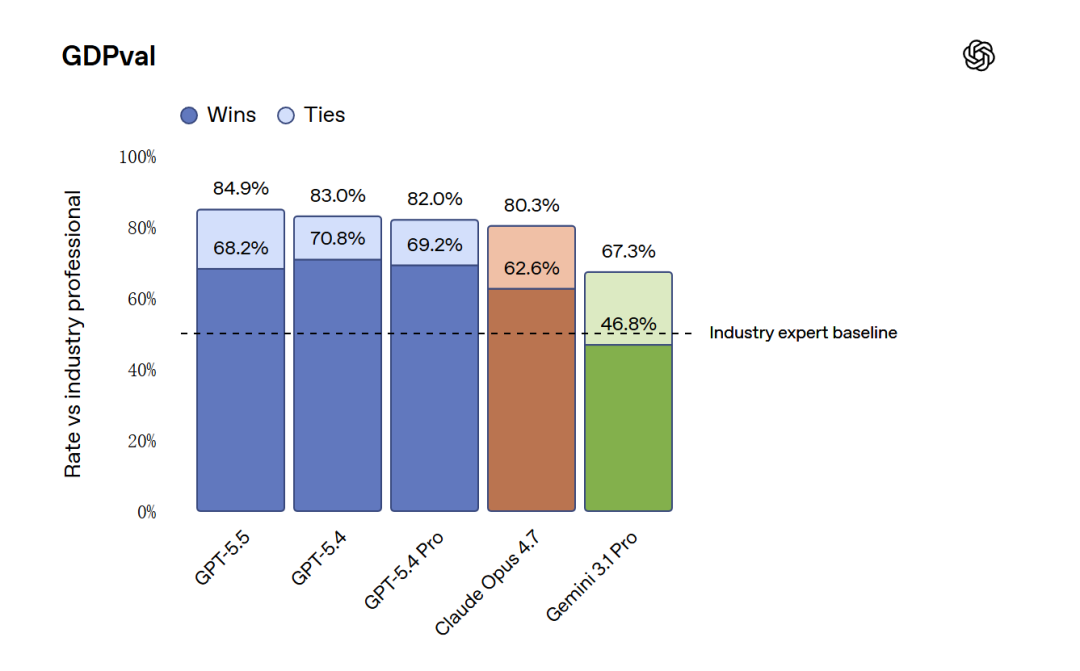 GPT-5.5 拿到 84.9%,领先 Claude Opus 4.7 的 80.3%。