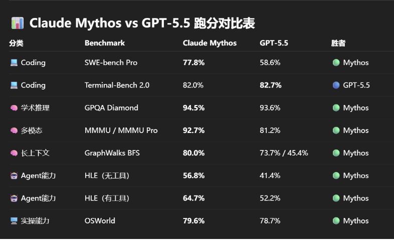 但 Anthropic 手里还有一个天才,叫 Claude Mythos。把 Claude Mythos 也拉进来一起看,8项核心benchmark里,GPT-5.5只在Terminal-Bench 2.0(考验长流程终端操作能力)上赢了0.7个点。其余7项,Mythos全部领先。