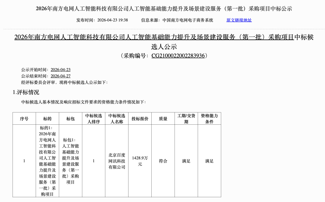 4月23日,2026年南方电网人工智能科技有限公司人工智能基础能力提升及场景建设服务(第一批)采购项目开标,北京百度网讯科技有限公司中标,投标报价1428.9万元。