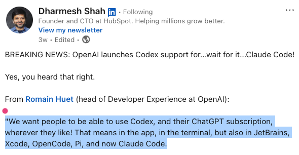 OpenAI开发者体验主管Romain Huet的原话:"We want people to be able to use Codex, and their ChatGPT subscription, wherever they like!"