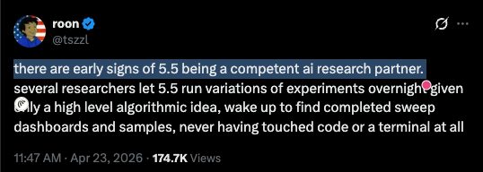 OpenAI员工@tszzl透露已有研究者用GPT-5.5做"隔夜实验":给个算法idea,通宵跑,醒来dashboard就绪。他的措辞是"competent AI research partner"。不是assistant,是partner。