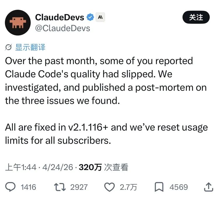 此前两者的竞争里,势头已经被Anthropic拿走,但这一次OpenAI的势头回来了。在发布当天,Claude官方开发平台账号发布公告,承认了大家诟病已久的“降智”问题,并表示已经修复。