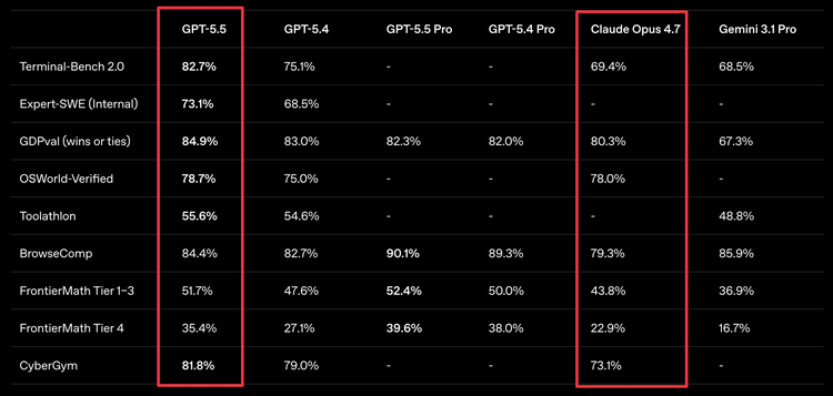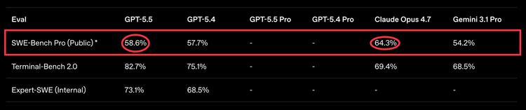 SWE-Bench Pro(编码):GPT-5.5不及Opus 4.7。@deedydas指出OpenAI刻意没在发布材料里报这个成绩——"trying really hard to bury the lede."