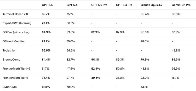 GPT-5.5来了。API定价$5/$30每百万token,GPT-5.4的两倍。