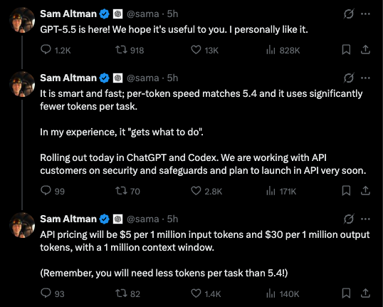 Sam Altman在公布定价的同一条推文里补了一句:"Remember, you will need less tokens per task than 5.4!" 贵一倍,但每个任务token更少——"其实更划算"。OpenAI总裁Greg Brockman在发布会上给了更大的词:"a new class of intelligence."