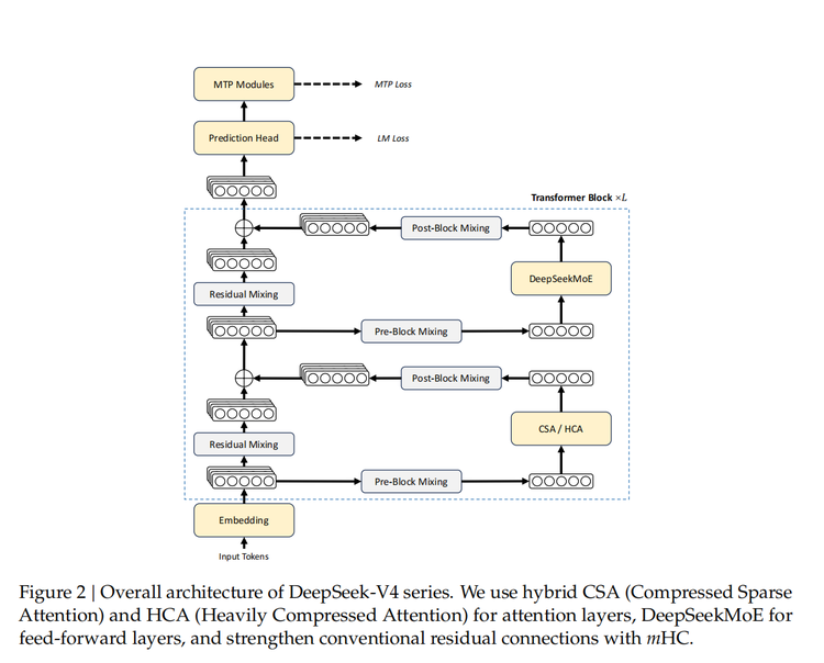 DeepSeek V4 的办法不是凑合,而是直接改造注意力机制本身。总体架构上,注意力层采用 CSA 和 HCA 交错配置,前馈层沿用 DeepSeekMoE,残差连接用 mHC 加强。核心是两种新注意力。