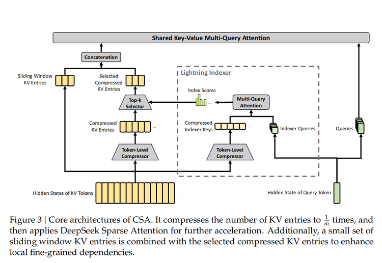 CSA 的数据流分三路并行。KV token 的隐藏状态同时进入三个模块:一个 Token-Level Compressor 负责把每 4 个 token 的 KV 缓存压缩成一个条目;一个 Lightning Indexer 生成“索引键”,用于后续的匹配打分;同一个索引器还生成“索引分数”。查询 token 的隐藏状态则单独进入 Lightning Indexer,生成查询侧的索引分数。两边一合,送入 Top-k 选择器,从所有压缩块中只挑出最相关的 512 个(Pro 版是 1024 个)。最后,这些选中的压缩块和滑动窗口里保留的 128 个原始 token 拼在一起,送进核心的多查询注意力计算。