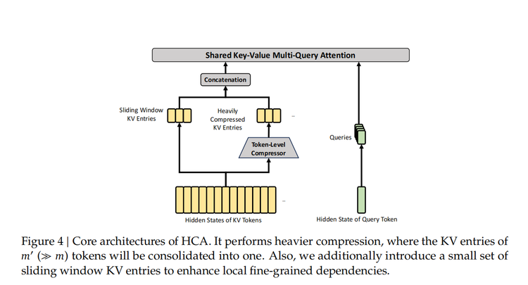 和 CSA 不同,HCA 去掉了整个稀疏选择链路——没有 Lightning Indexer,没有 Top-k Selector。数据流非常直接:KV token 隐藏状态经过 Token-Level Compressor 压缩(压缩比 m'=128,远大于 CSA 的 4),得到的压缩条目直接与滑动窗口 KV 拼在一起,送进 MQA。因为每条目覆盖 128 个 token,条目总量已经很少,全量算也不贵,省掉了筛选环节。这是为了抓全局结构,避免模型“只见树木不见森林”。