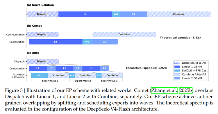 你可以这样理解,MoE 每次计算都要在不同 GPU 之间搬运中间结果,以前是搬完才算,搬运时长全在等。现在是把搬运拆碎,搬一小批就算一小批,算的同时继续搬下一批。结果就是搬运时间被计算时间吃掉了,用户感觉不到等。这套机制不挑硬件,只要算力和带宽的比例到位,NVIDIA 还是昇腾都能跑出高利用率。