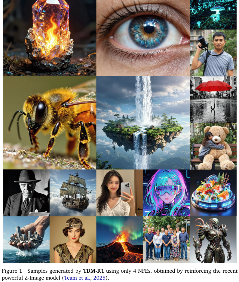 经过TDM-R1强化后的Z-Image模型,仅仅耗费4次函数评估次数 (NFE),就能生成极其逼真且细节丰富的图像。