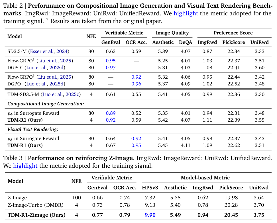 TDM-R1通过引入动态替代奖励机制,配合确定性的采样轨迹,成功化解了少步数生成模型,无法利用大规模不可微奖励的难题。