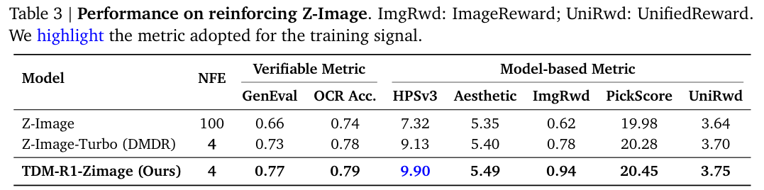 搭载了TDM-R1的4步Z-Image模型,在各项指标上全面超越了耗费100步的原始Z-Image,以及同样是4步的Z-Image-Turbo版本。