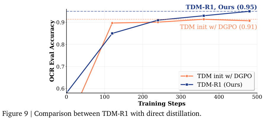 TDM-R1能够在训练全程源源不断地吸收新的奖励信号,性能得分就像一条不断攀升的曲线,远远甩开了传统蒸馏方式。