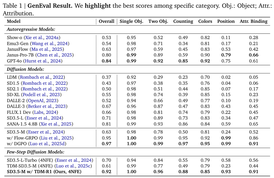 经过TDM-R1加持的SD3.5-M模型,仅仅使用4步生成,就在GenEval测试中拿下了0.92的惊人高分。