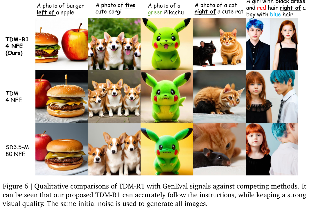 定性对比更加直观。当你要求画一个“在苹果左边的汉堡”,或者“五个可爱的柯基”,TDM-R1能精准满足要求,画面质感极佳,而基础的TDM模型和80步的基础模型要么画错了位置,要么画错了数量。
