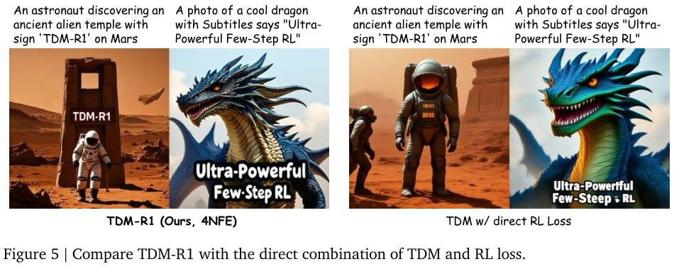 上图直观展现了这种机制的优势。在要求画一个带有“TDM-R1”标牌的宇航员或者带有字幕的龙时,如果直接用传统强化学习损失配合TDM,画面会变得非常模糊且色彩失真,TDM-R1的4步生成结果不仅文字清晰,画面质感也远超传统方式。